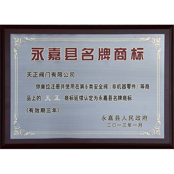 永嘉县名牌商标(第6类安全阀)